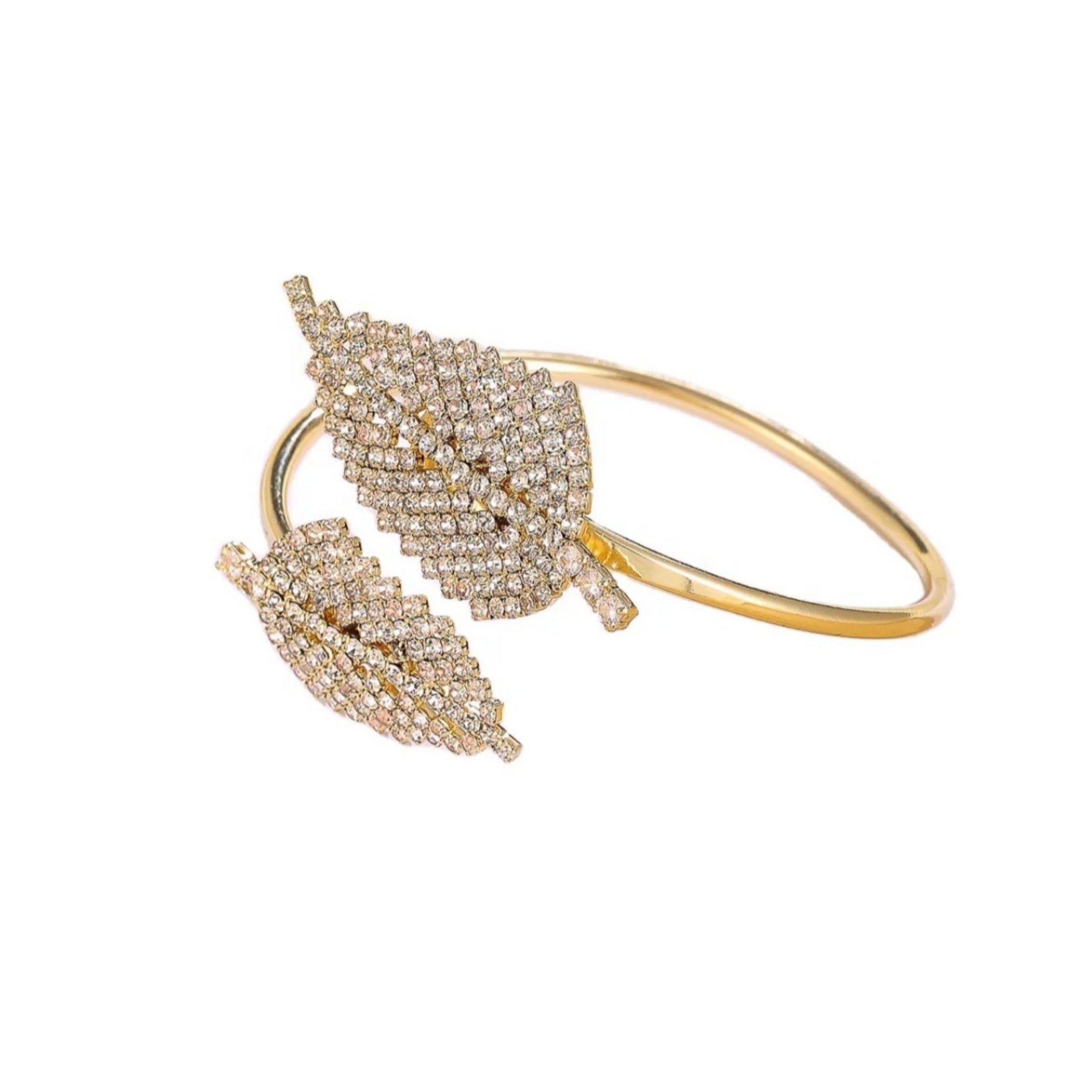 This Rhinestone leaf-designed gold-plated bracelet offers a stunning finish that leaves those around you mesmerized with its beauty. The solid cuff bracelet can be worn on both hands and aligns well with current fashion trends. The distinct leaf design gives the bracelet a new look reflecting charm and glamour to all those who have a flair for fashion. The rhinestone fashion jewelry bracelet has a dimension of 6.5cm and is size adjustable. The zinc alloy material gives it a unique look and smoothness that all fashion lovers truly admire.
