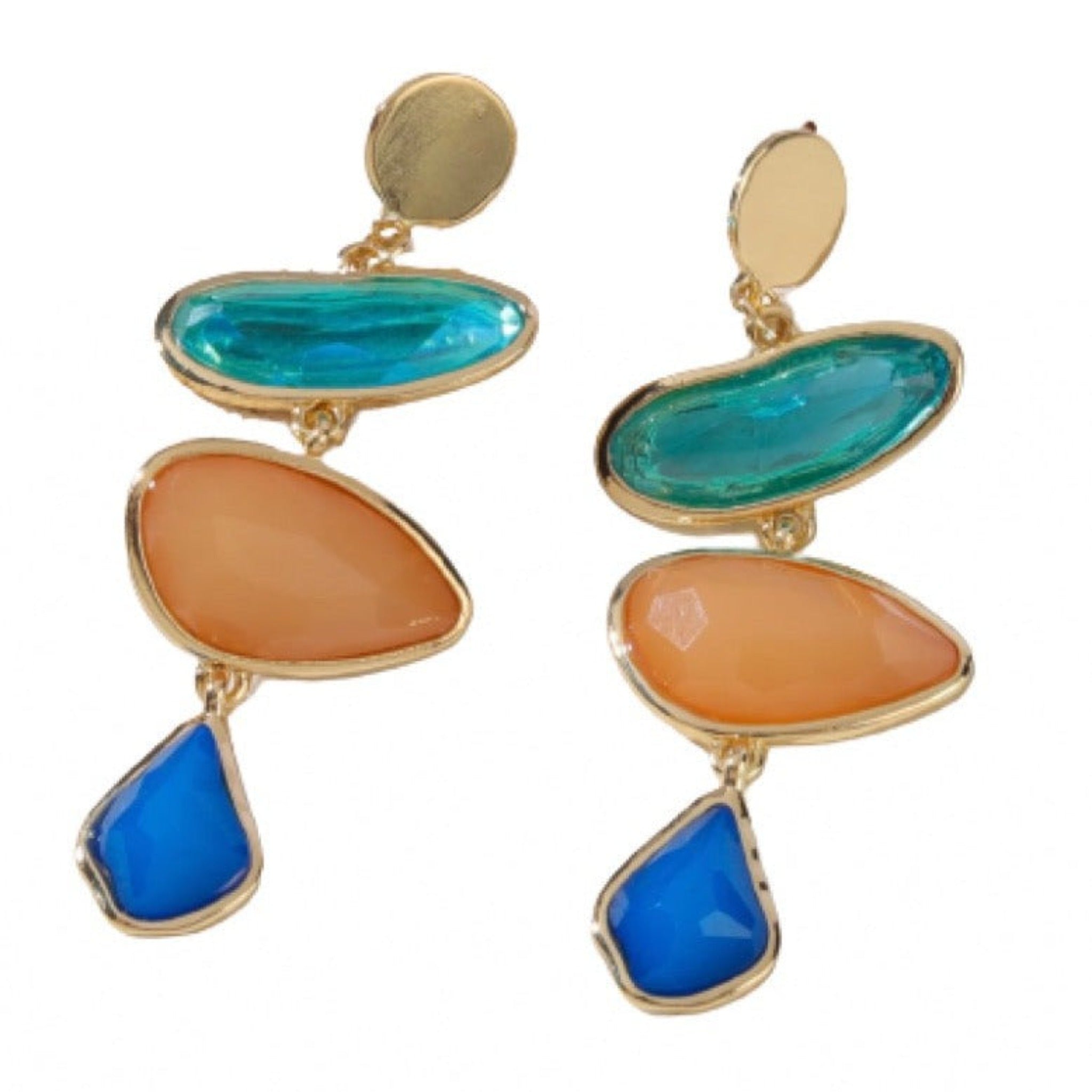 The colorful earring is a perfect fashion statement for women. This elegant fishhook drop earring has three resin stones—Sea-blue, toffee, and blossom green—that enhance the look. The gems rest on a gold-plated base which is perfectly distinctive from the stones. The not-so-neutral colors can pair up with any dark base of clothing.