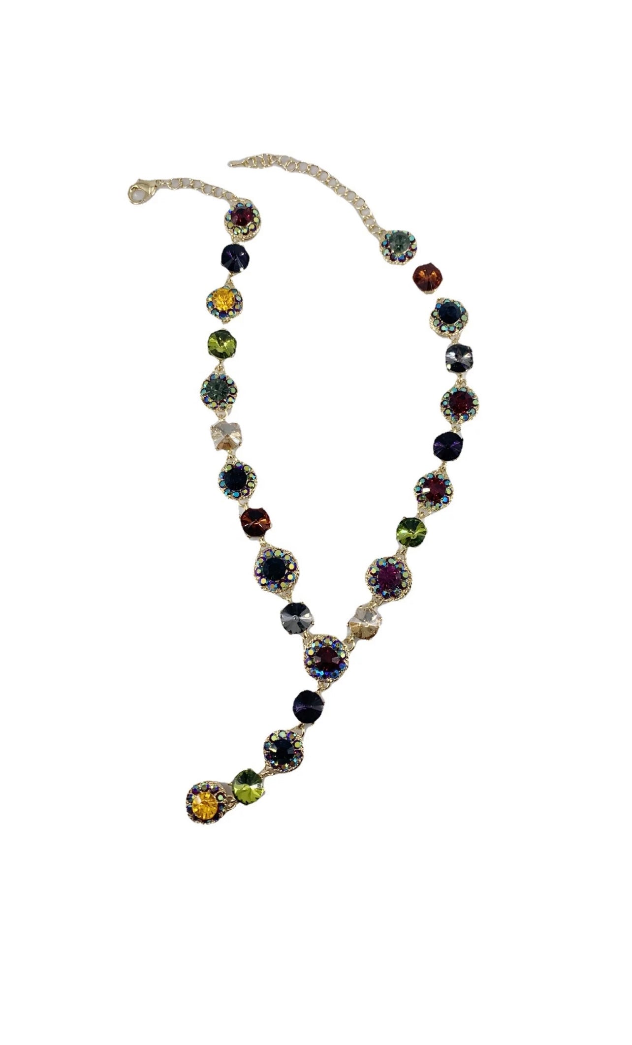 It is a colorful collection of crystal stones that will add colors to your splendor in the most elegant of ways around your neck. The crystals stones are nothing short of gracious art of crafting skills. The exclusive ornament is a chic adornment to be worn at any wedding or party. It is trussed with a gold-plated chain on the end of both sides which gives it a perfect finish. The chain is made of zinc alloy. This can be paired with your attire to a wedding or any party without any second thoughts.